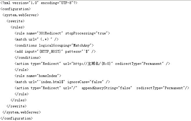 然后就是基于windows平臺(tái)下的301重新定向。因?yàn)閣indows平臺(tái)下的IIS和Linux的平臺(tái)存在著一定的差別,對此需要和IDC供應(yīng)商進(jìn)行商討,了解基于windows平臺(tái)下的IIS配置。在windows平臺(tái)下,可以在根目錄下創(chuàng)建一個(gè)web.config文件,然后在這個(gè)文件中輸入下面的代碼,具體如下圖所示。