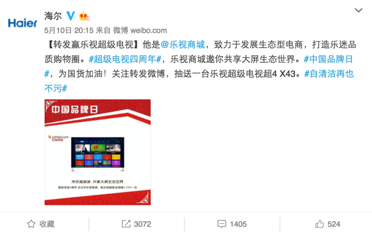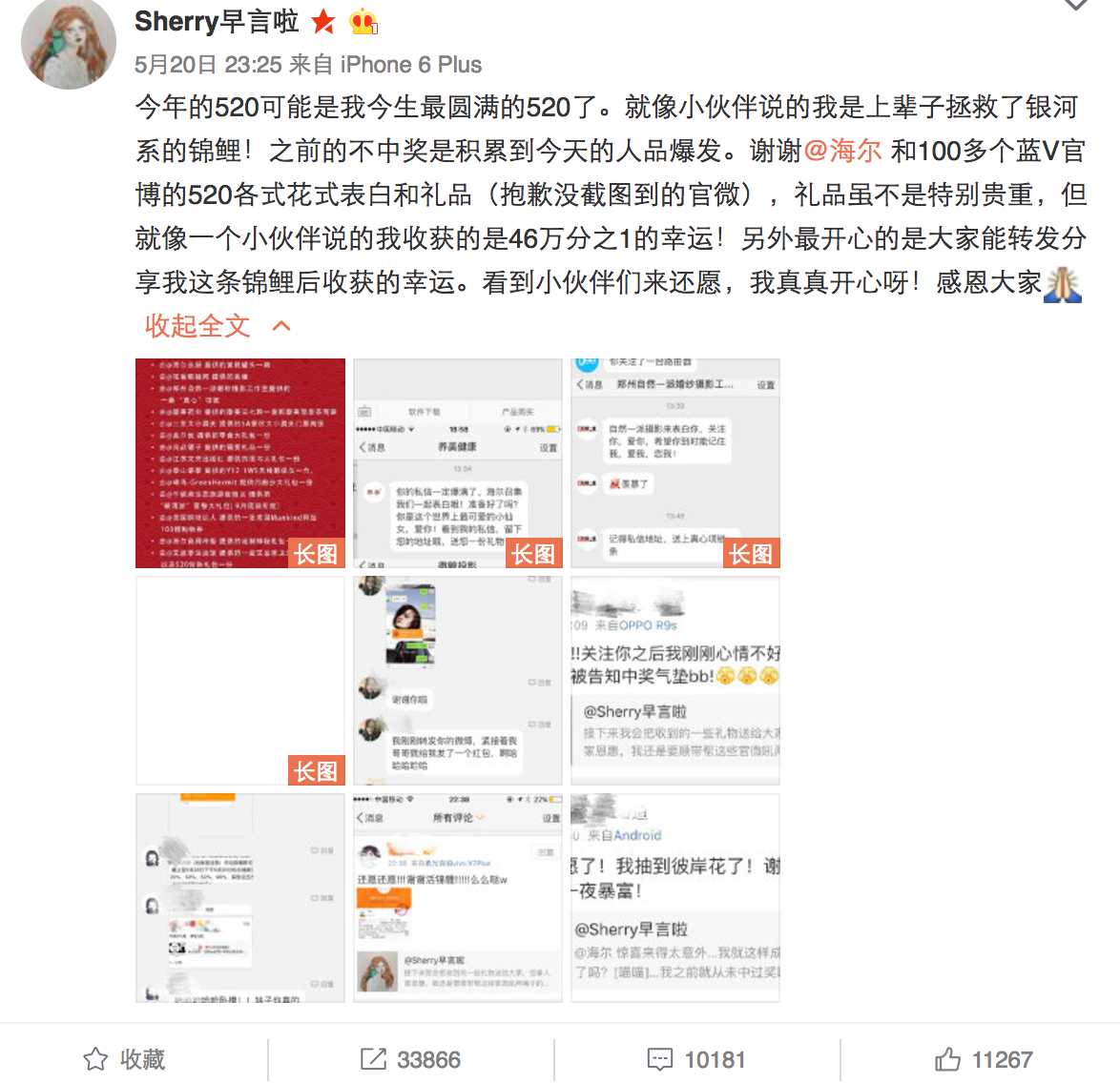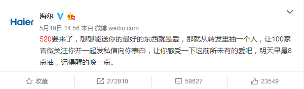 520表白日,海爾搞了一個事情,聯(lián)合60多家藍(lán)V,給一位幸運(yùn)粉絲送禮物。這條轉(zhuǎn)發(fā)評論送禮物的微博在半個小時之內(nèi)就轉(zhuǎn)發(fā)過萬。