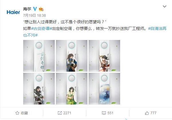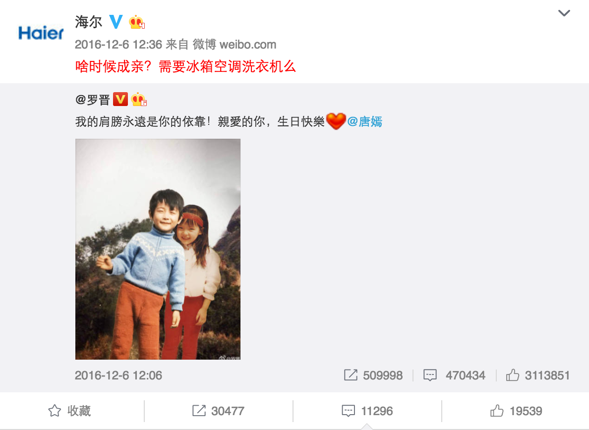 說到海爾,大家的第一印象大多都是搶熱門。比如唐嫣羅晉公布戀情時,海爾官微借勢發(fā)布微博"啥時候成親?需要冰箱空調(diào)洗衣機(jī)么"成功帶領(lǐng)了一眾藍(lán)V搞事情,因?yàn)檫@個句式很容易被模仿,所以藍(lán)V的參與度非常高。