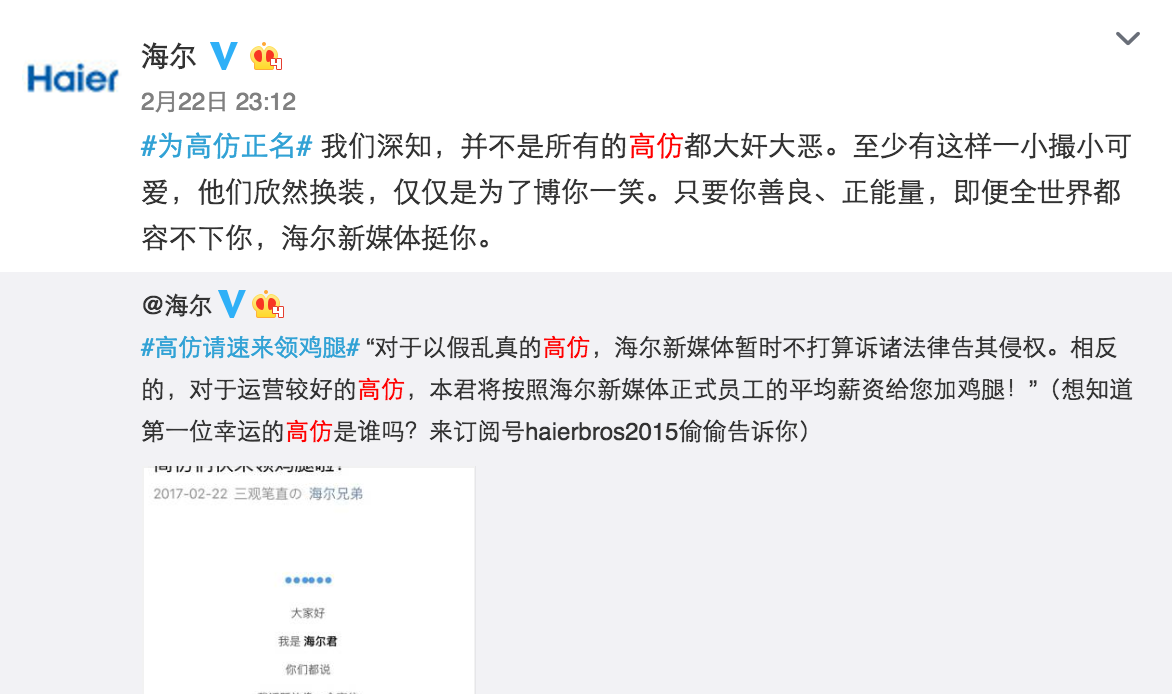 不知道從什么時候開始,平時刷微博時你會發(fā)現(xiàn)很多的高仿號,潛伏于各大評論中真假難辨。@海爾作為藍(lán)V總教頭,也遇見過很多海爾的高仿號,后來發(fā)現(xiàn),其實(shí)這些高仿號是海爾的年輕用戶,他們想搶熱門,跟你的粉絲有效互動。面對這么一批可愛的小粉絲,@海爾沒有封殺,而是做官方聲明,只要你善良,且正能量,哪怕全世界都不管你我們呼喚你,甚至還給高仿號發(fā)福利。