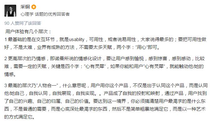 大神的這個(gè)解釋是不是很哲學(xué)?說(shuō)了一大頓根本不知道在說(shuō)什么。通俗的解釋是,產(chǎn)品用戶(hù)體驗(yàn)做的好,就是我們用產(chǎn)品的時(shí)候感覺(jué)好,便利親切,一切以我們的角度來(lái)設(shè)計(jì)。