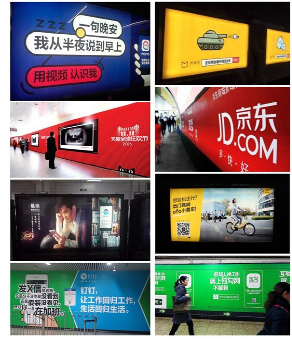 簡(jiǎn)單配色、重復(fù)表達(dá)。網(wǎng)易云音樂(lè)、知乎、陌陌、美團(tuán)、京東都用,產(chǎn)品代表色來(lái)進(jìn)行地鐵刷屏,長(zhǎng)時(shí)間內(nèi)大量重復(fù),可以讓人將品牌與顏色畫上等號(hào),進(jìn)而達(dá)到占領(lǐng)消費(fèi)者心智的目的。